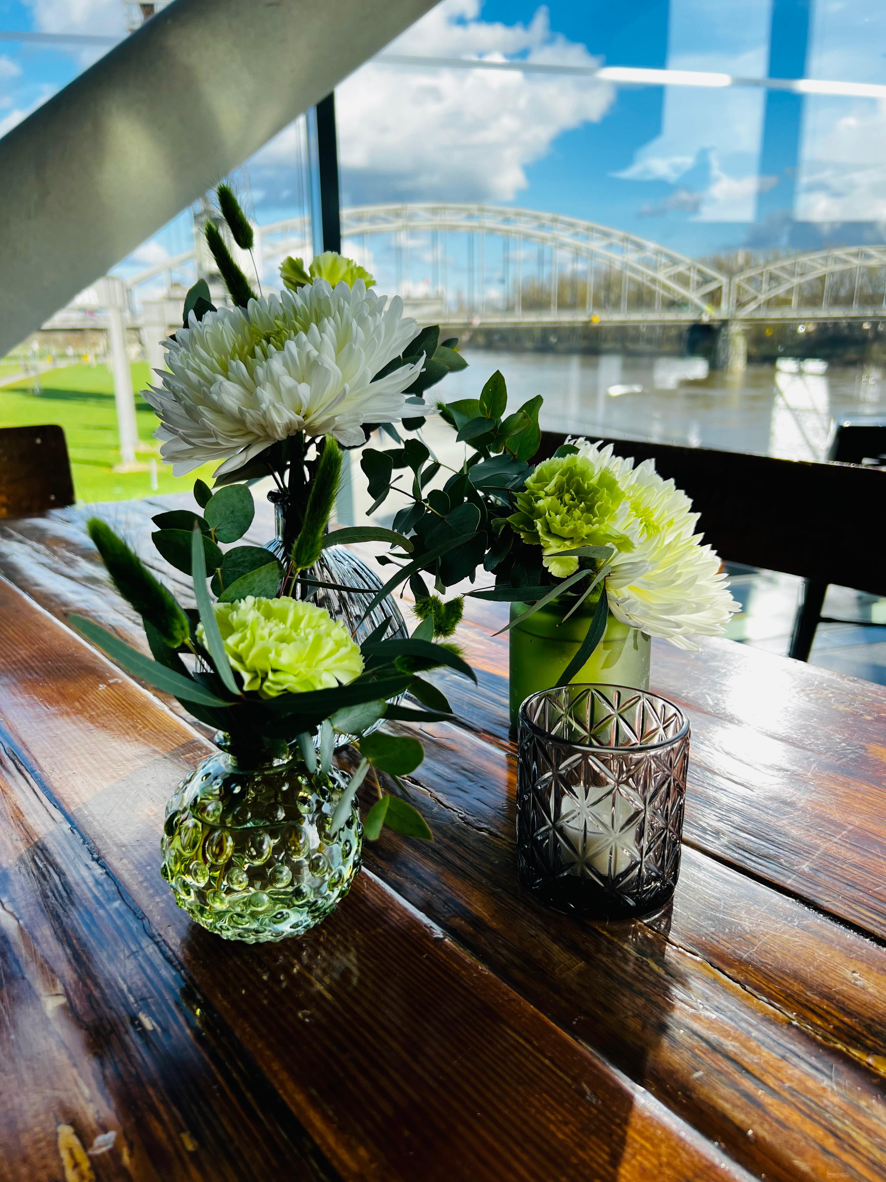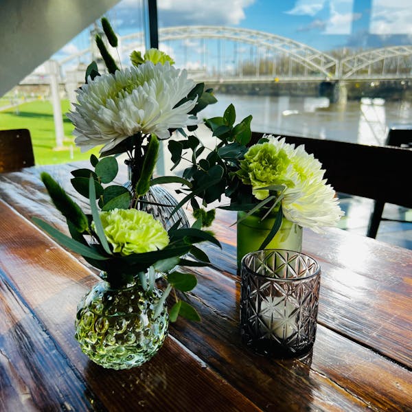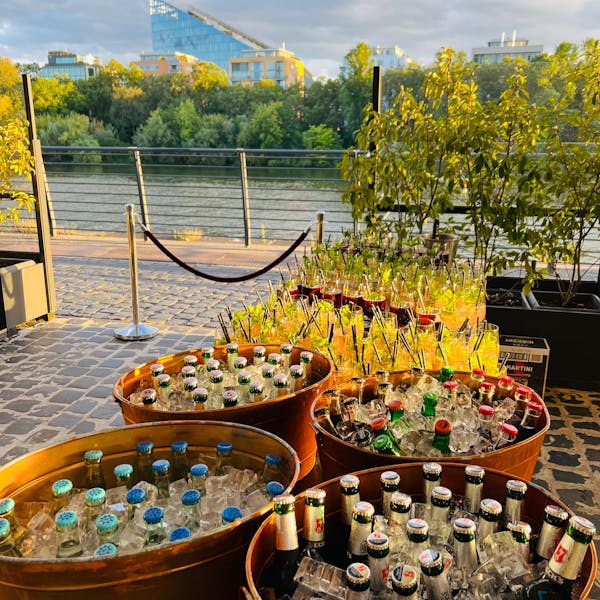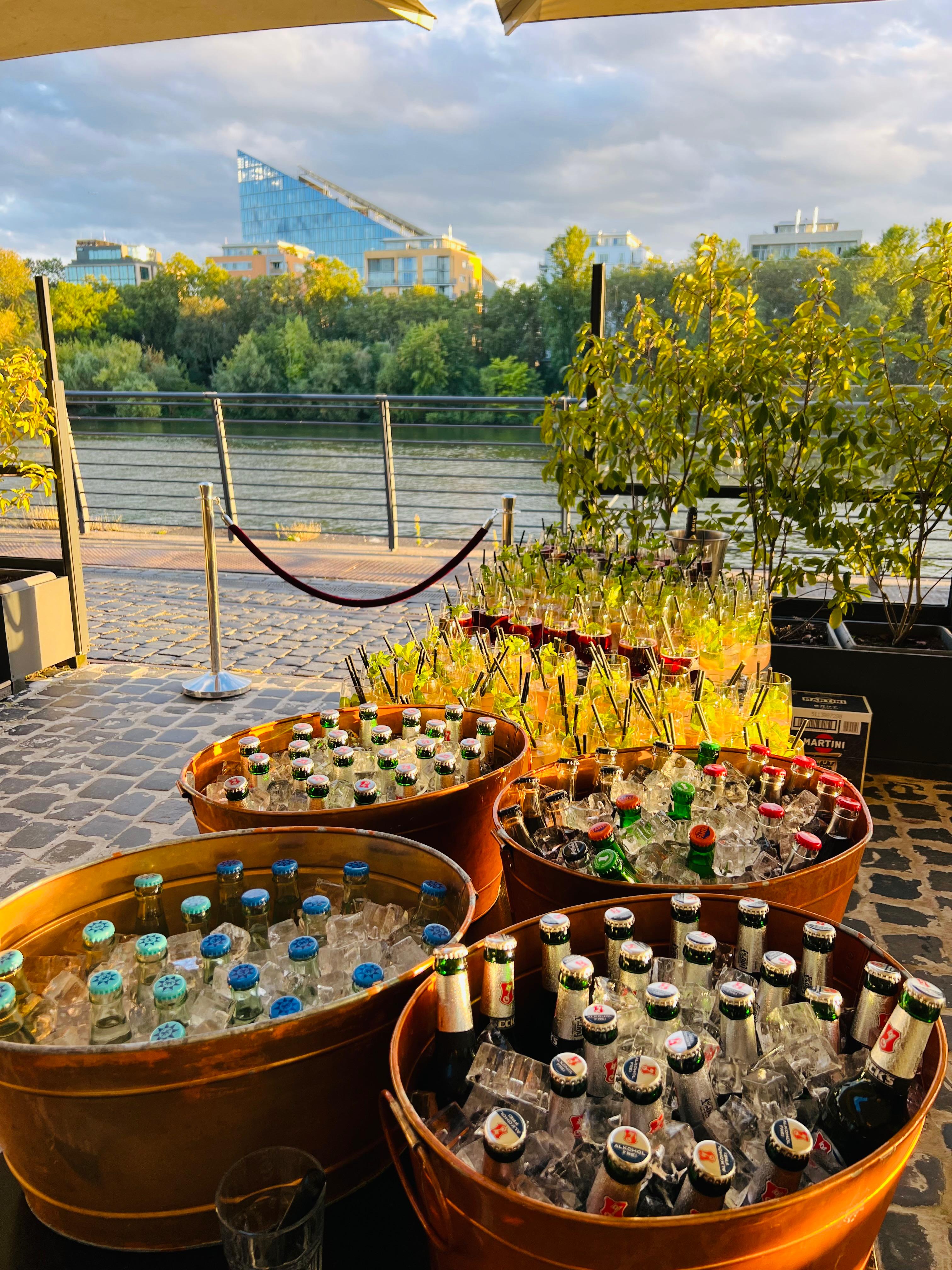 In the OOSTEN, built transparently from glass, steel, exposed concrete and wood, you always sit on the sunny side. In the restaurant, at the bar and in the lounge, in the beer garden under the plane trees or on the terraces, spectacular 270-degree views of the Frankfurt skyline and the urban river landscape, the glass façade of the ECB, the "Deutschherrnbrücke" and "Honsellbrücke" are included.